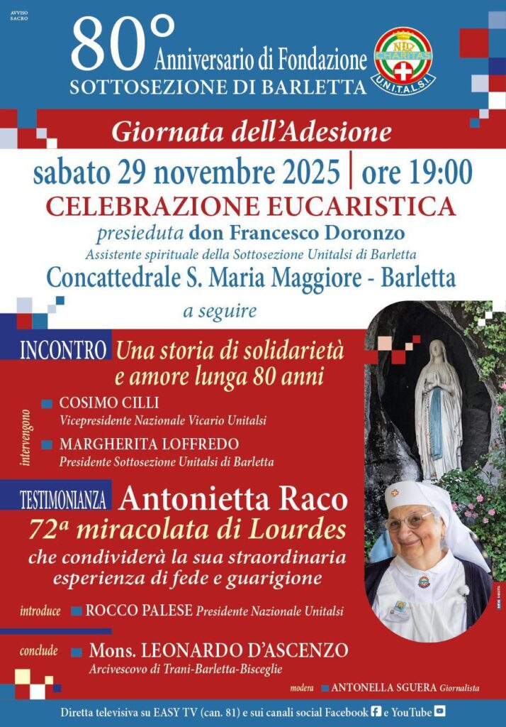 La Sottosezione Unitalsi di Barletta si prepara a celebrare un traguardo significativo della propria storia associativa: l’80° anniversario di fondazione. L’evento, che avrà luogo sabato 29 novembre 2025, si inserisce nella tradizionale Giornata dell’Adesione, momento annuale dedicato al rinnovo dello spirito di servizio che caratterizza l’impegno unitalsiano. La celebrazione… >