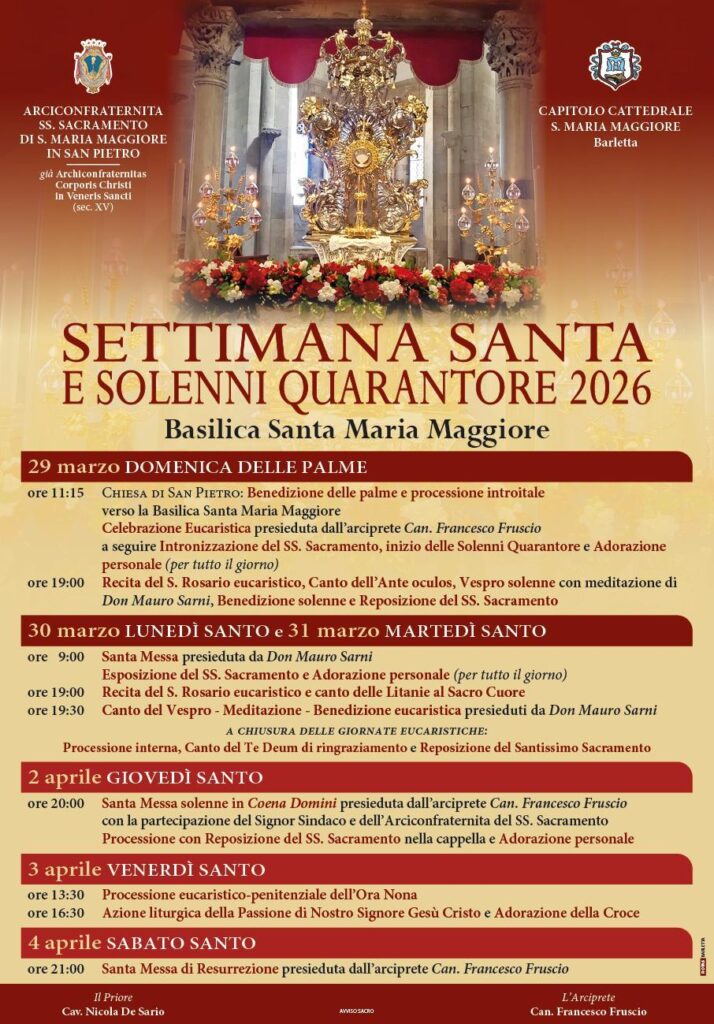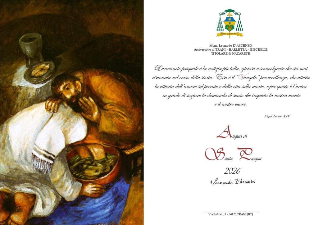 In Evidenza PASQUA 2026 “IN COMUNIONE” IN DIALOGO CON S.E. MONS. LEONARDO D’ASCENZO ARCIVESCOVO DI TRANI BARLETTA BISCEGLIE Omelia Liturgia della Croce parrocchia Immacolata Trinitapoli 3 aprile 2026 Arcivescovo Processione legno della croce Barletta 3 aprile 2026 Barletta l’Arcivescovo alla Liturgia eucaristico penitenziale Omelia Messa Coena Domini Parrocchia S cuore di Gesù San ferdinando di puglia 2 aprile 2026 BARLETTA. I RITI DELLA SETTIMANA SANTA In Diocesi 4 Aprile 2026 PASQUA 2026 “IN COMUNIONE” IN DIALOGO CON S.E. MONS. LEONARDO D’ASCENZO ARCIVESCOVO DI TRANI BARLETTA BISCEGLIE 4 Aprile 2026 Omelia Liturgia della Croce parrocchia Immacolata Trinitapoli 3 aprile 2026 4 Aprile 2026 Arcivescovo Processione legno della croce Barletta 3 aprile 2026 3 Aprile 2026 Barletta l’Arcivescovo alla Liturgia eucaristico penitenziale 3 Aprile 2026 Omelia Messa Coena Domini Parrocchia S cuore di Gesù … > 2 Aprile 2026 BARLETTA. I RITI DELLA SETTIMANA SANTA Archivio "in Diocesi" Mons. Leonardo D’ASCENZO Biografia Omelie Documenti Interventi Appuntamenti Pastorali Agenda del Vescovo Appuntamenti Pastorale Agenda del Vescovo Prossimi Appuntamenti 4Aprile ore 22:00 TRANI, CATTEDRALE, VEGLIA PASQUALE PRESIEDUTA DALL’ARCIVESCOVO 5Aprile ore 09:00 TRANI, CASA DI RECLUSIONE MASCHILE, SANTA MESSA DI PASQUA 6Aprile ore 10:00 TRANI, CASA DI RECLUSIONE FEMMINILE, SANTA MESSA PRESIEDUTA DALL’ARCIVESCOVO 10Aprile ore 19:30 PER UNA PASTORALE DEL VINCOLO E DELLA PROSSIMITA’: IN ASCOLTO DEI SEGNI DEI TEMPI Tutti gli Appuntamenti Il tuo browser non supporta i frame ULTIMO NUMEROFacebook Arcidiocesi di Trani Barletta Bisceglie YouTube PASQUA 2026 “IN COMUNIONE” IN DIALOGO CON S.E. MONS. LEONARDO D’ASCENZO. Arcivescovo Processione legno della croce Barletta 3 aprile 2026 Barletta l'Arcivescovo alla Liturgia eucaristico penitenziale MESSA CRISMALE CATTEDRALE DI TRANI 1 APRILE 2026 Auguri dell'Arcivescovo alla Curia Pasqua 2026 Corato 30 marzo 2026 Pasqua 2026 Corato 30 marzo 2026 Ritiro per gli operatori della Curia Pasqua è l’incontro con il Risorto che ama e si dona: il messaggio dell’Arcivescovo D’Ascenzo PASSIONE DEL SIGNORE SECONDO MATTEO A.D.2026-Commento al Vangelo di don Francesco Piazzolla biblista Instagram arcidiocesi_di_trani 👣 _Pellegrini con il Pellegrino...verso Betlemm Post su Instagram 18079846948512337 Invitiamo i giovani e i responsabili dei gruppi gi COMUNICATO STAMPA PRESENTAZIONE DEL LIBRO Post su Instagram 18025107710271724 Post su Instagram 18127139836376518 SDAFS – Linee guida circa le situazioni di fragi TORNA IL PROGETTO "SEMI DI LEGALITA'" Anche quest Campioni digitali o Prigionieri virtuali? Secondo Segui su Instagram Twitter