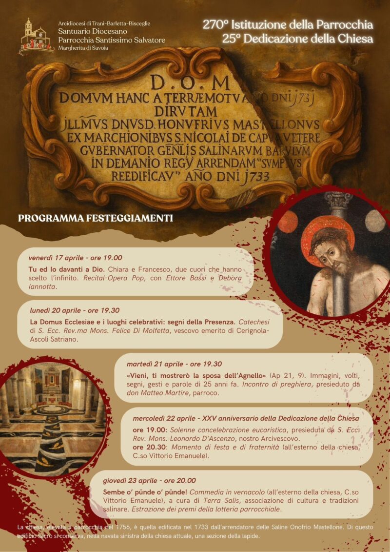Un ricco programma di appuntamenti ha segnato un momento significativo per la comunità ecclesiale di Margherita di Savoia, chiamata a celebrare il 270° anniversario dell’istituzione della Parrocchia del Santissimo Salvatore e il 25° anniversario della dedicazione della chiesa.