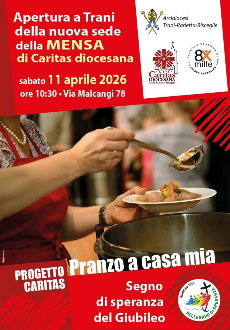 Sabato 11 aprile 2026, a Trani, in via Malcangi 78, alle 10.30, l’Arcivescovo mons. Leonardo D’Ascenzo inaugurerà la nuova sede della mensa della Caritas diocesana di Trani-Barletta-Bisceglie.