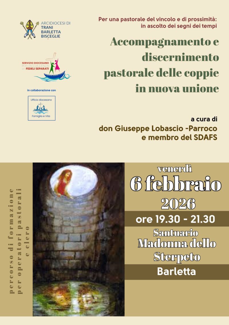 Carissima comunità diocesana, siamo lieti di inviarvi la locandina del primo incontro di formazione diocesano per operatori pastorali, religiosi/e, realtà ecclesiali e presbiteri che si terrà il prossimo venerdì 6 febbraio presso il Santuario dello Sterpeto a Barletta in cui ci ritroveremo, dalle ore 19.30 alle ore 21.30, per riflettere insieme su un tema delicato della vita delle nostre comunità: l’accompagnamento e il discernimento pastorale delle coppie in nuova unione. Questo … Continua a leggere »
