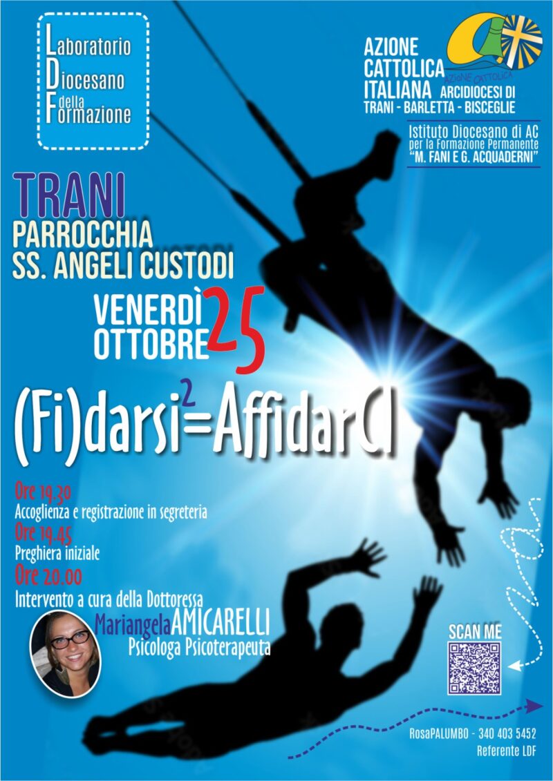 (Fi) darsi²=AffidarCi è il titolo del primo laboratorio, che sarà guidato dalla dott.ssa Mariangela Amicarelli. Interrogarsi sul significato delle esperienze di vita in un’ottica intergenerazionale. Questo l’obiettivo della serata, rivolta a responsabili, animatori ed educatori di Ac provenienti da tutta la diocesi. La parola chiave di quest’anno sarà fidarsi. Necessario, infatti, per tessere buone relazioni educative sarà porre la fiducia in tutti coloro che percorreranno lo stesso itinerario formativo per crescere e camminare insieme, accogliendo nella storia di ciascun gruppo anche gli ultimi e gli emarginati e che, per primo, si fida di noi per realizzare il Suo progetto di felicità per l’umanità.
