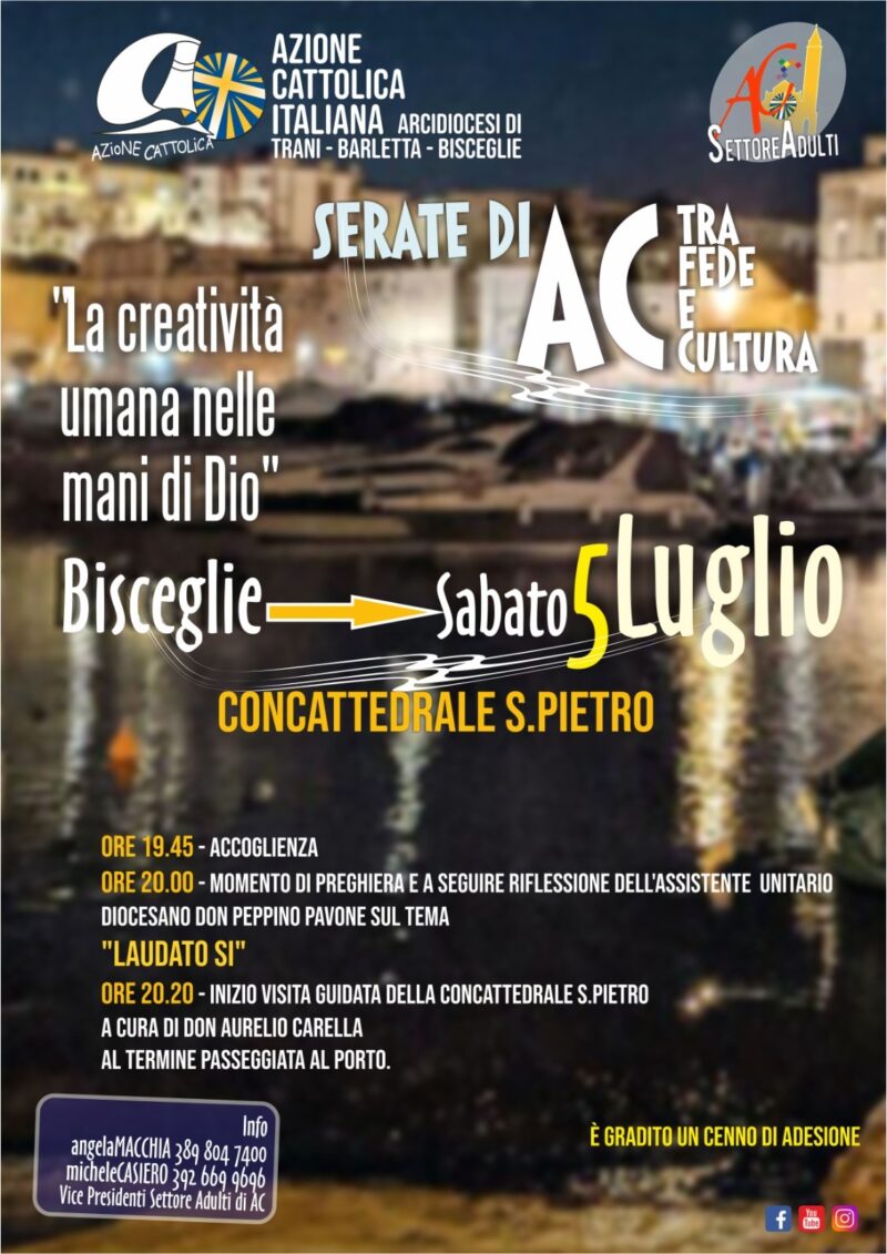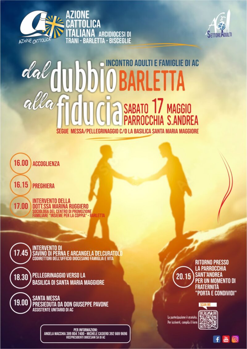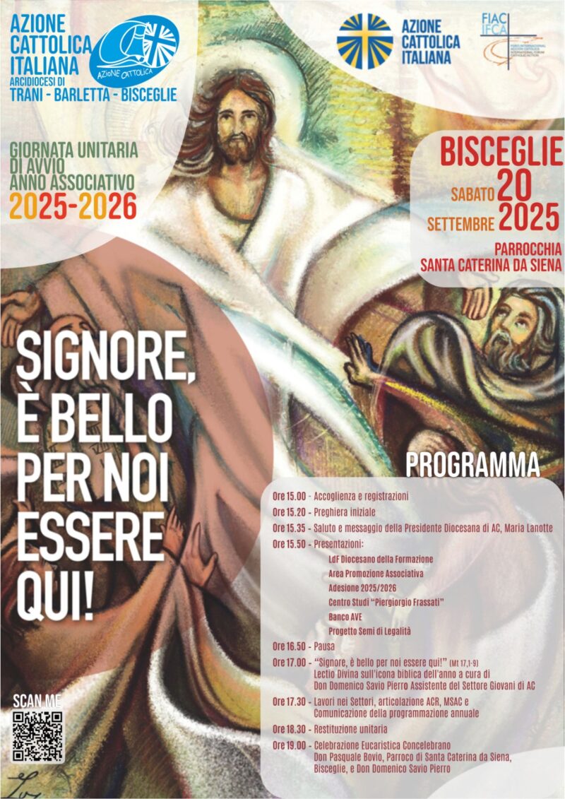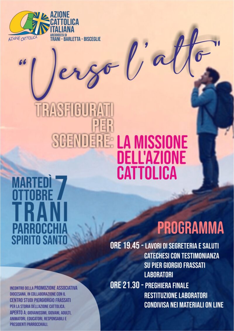 “Verso l’alto”: Trasfigurati per Scendere: La missione dell’Azione Cattolica a cura della Promozione associativa diocesana dell’Azione Cattolica Italiana in collaborazione con il Centro studi “Pier Giorgio Frassati” Il prossimo 7 ottobre presso la Parrocchia dello Spirito Santo di Trani alle ore 19,45 si svolgerà l’incontro di PROMOZIONE ASSOCIATIVA dell’Azione Cattolica diocesana. Come Azione Cattolica Diocesana vogliamo intraprendere insieme un percorso che ci chiede di volgere … Continua a leggere