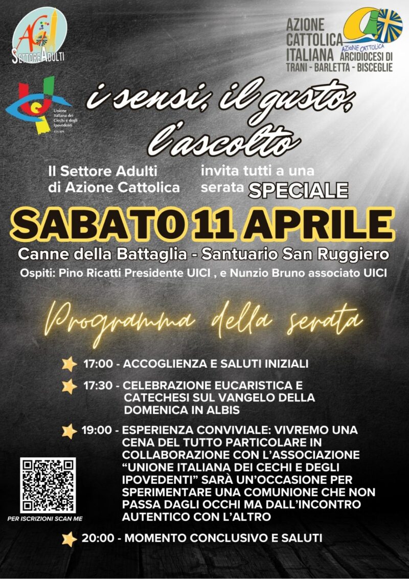 Alle ore 19.00 si svolgerà «un prezioso momento di agape fraterna con gli amici dell’UICI  – si legge in una comunicazione a firma di mons. Giuseppe Pavone, Assistente unitario dell’Azione Cattolica Maria Lanotte, Presidente diocesana di AC Angela Macchia e Giuseppe Cacamo, Vicepresidenti del Settore Adulti di AC L’Équipe diocesana di Azione Cattolica –  di  sperimentare una comunione che non passa solo attraverso gli occhi, ma dall’incontro autentico con l’altro che attraversa la soglia del cuore e sceglie di abitarlo. La serata terminerà con i saluti dei vicepresidenti Adulti Angela Macchia e Giuseppe Cacamo. L’appuntamento è rivolto ai responsabili parrocchiali e diocesani, agli animatori, agli educatori, agli adulti, ai giovani e a tutti gli amici interessati alla tematica».
