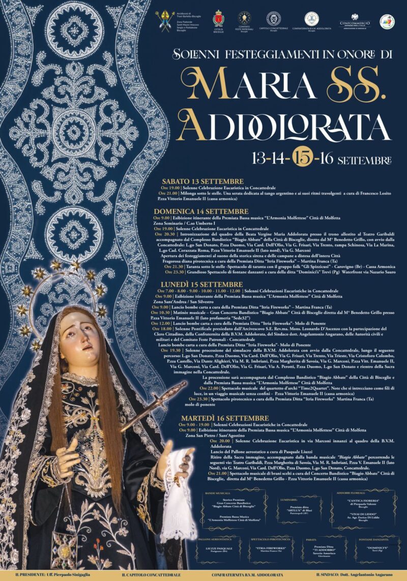 Bisceglie si prepara a vivere uno dei momenti più attesi e sentiti della propria tradizione religiosa: la Festa Patronale 2025 in onore dei Santi Martiri Mauro Vescovo, Sergio e Pantaleo, patroni della città e dell’arcidiocesi. L’appuntamento che segna l’inizio ufficiale delle celebrazioni è fissato per sabato 26 luglio alle ore 17.45 presso il Museo Diocesano, dove si terrà la conferenza stampa di presentazione del programma. … Continua a leggere »