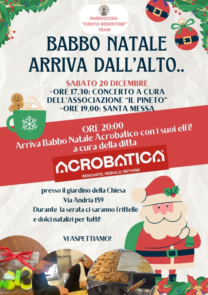 La parrocchia Cristo Redentore di Trani si prepara a vivere una serata di festa e condivisione in vista del Natale. Sabato 20 dicembre il giardino della chiesa, in via Andria 159, accoglierà grandi e piccoli con un programma che unisce musica, spiritualità e intrattenimento. Alle 17.30 è previsto il concerto a cura dell’associazione “Il Pineto”, seguito alle 19 dalla celebrazione della Santa Messa. Alle 20 l’attesa si sposterà sullo spettacolo con l’arrivo di Babbo Natale acrobatico insieme ai suoi elfi, a cura della ditta Acrobatica. Durante la serata non mancheranno frittelle e dolci natalizi, per un clima di autentica gioia comunitaria.