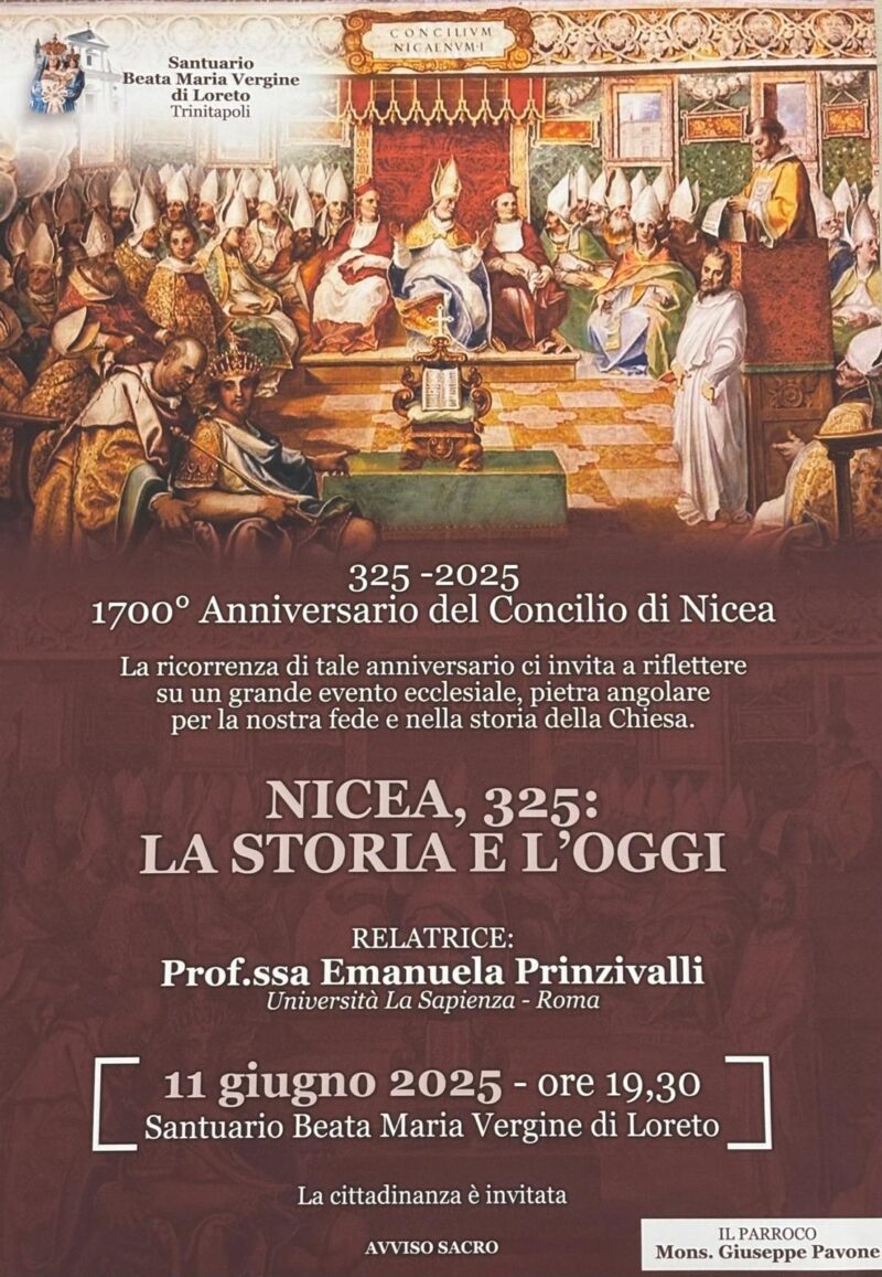 Carissimi, si fa prossima la data di un’iniziativa importante programmare dal Consiglio Pastorale Parrocchiale in ricordi del 1700^ anniversario del Concilio di Nicea (325). Una data fondamentale e pietra migliore per la nostra fede e per la storia. VI INVITO TUTTI!! NON DOVETE MANCARE alla conferenza che terrà la professoressa Emanuela Prinzivalli, docente emerita dell’Università “la Sapienza” di Roma. Un luminare nel campo storico teologico. … Continua a leggere
