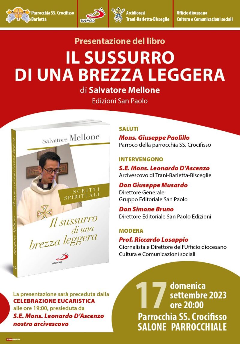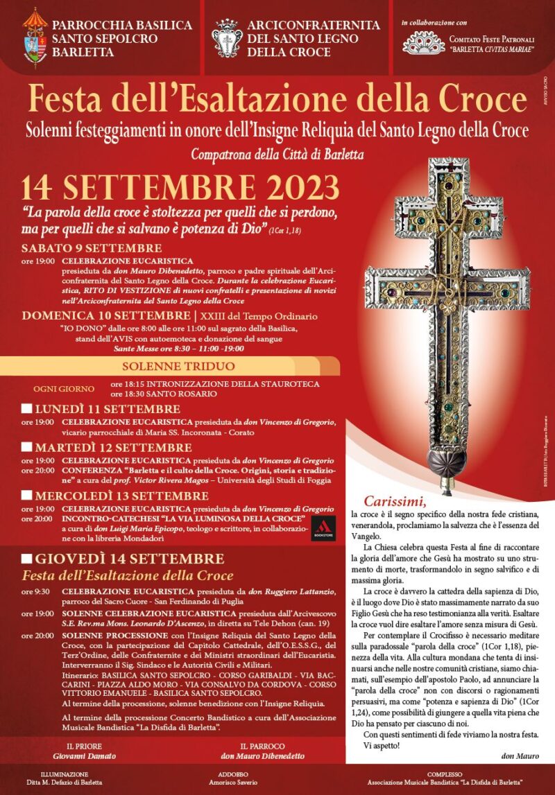 Guarda il video integrale Scarica l’omelia dell’Arcivescovo Oggi, 20 ottobre 2023, Festa della Chiesa diocesana nella ricorrenza dell’anniversario della Dedicazione della Cattedrale di Trani, con la solenne concelebrazione presieduta dall’Arcivescovo, prevista a Bisceglie, presso la Chiesa di San Giuseppe, con inizio alle ore 19.00 il Convegno pastorale diocesano si avvia alla conclusione. Una assise della durata di tre giorni, che ha registrato circa mille presenze, … Continua a leggere