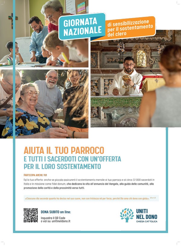 Comunicato_stampa_XXXVII_Giornata_Nazionale_di_sensibilizzazione_per_il_sostentamento_del_clero Un gesto di riconoscenza verso i sacerdoti che ogni giorno si prendono cura delle nostre comunità. È questo l’invito che la Chiesa italiana rivolge ai fedeli in occasione della XXXVII Giornata Nazionale di sensibilizzazione per il sostentamento del clero, in programma domenica 21 settembre 2025. I sacerdoti, oggi più che mai, rappresentano una risorsa fondamentale. Sono annunciatori del Vangelo nella concretezza della vita quotidiana, … Continua a leggere