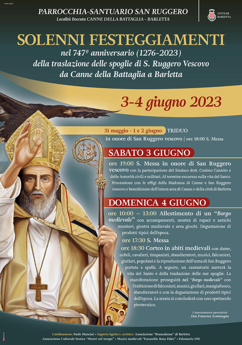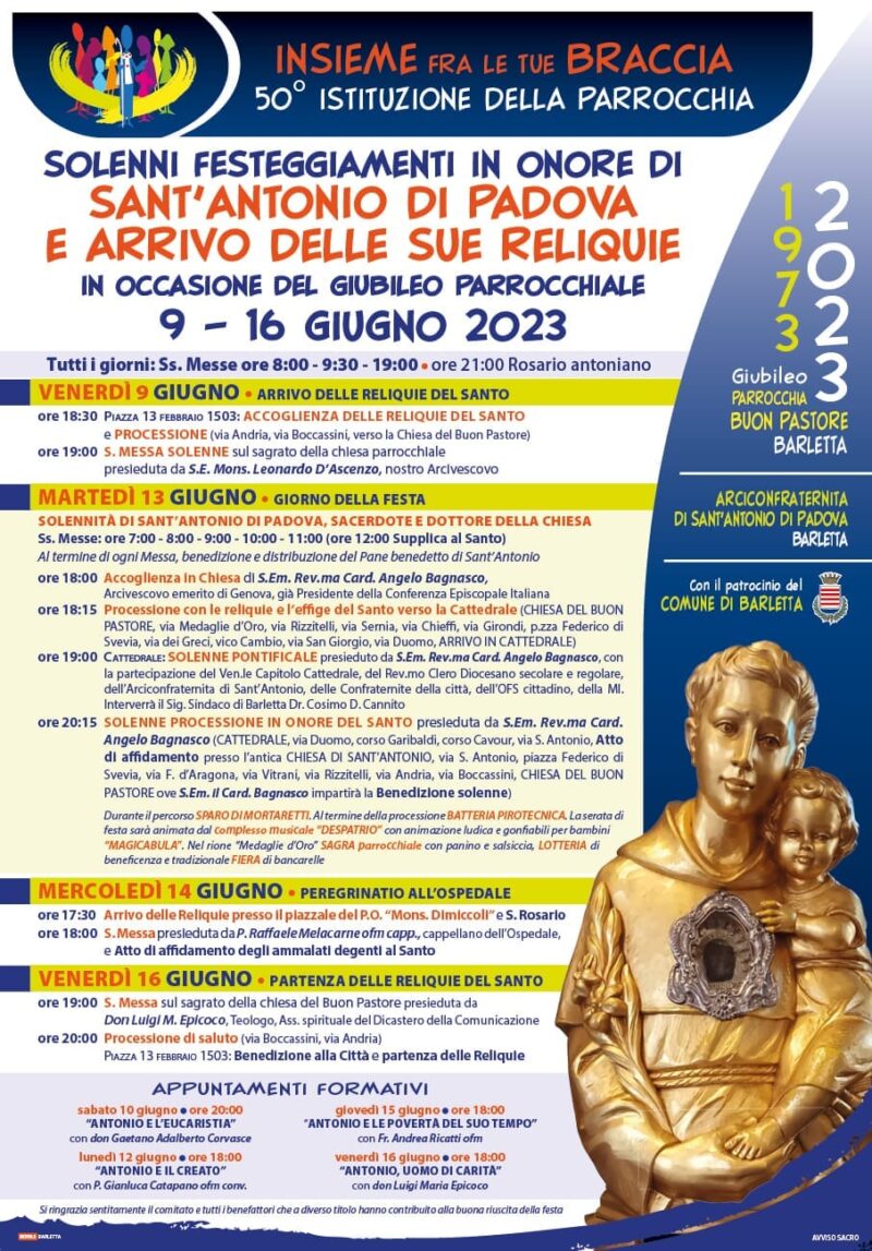 PROGRAMMA TRIDUO IN PREPARAZIONE ALLA FESTA 29 GIUGNO ORE 18,00 – 18.45 CONFESSIONI ORE 18.30 S. ROSARIO ORE 19.00 S. MESSA PRESIEDUTA DA DON COSIMO DAMIANO DELCURATOLO VICARIO EPISCOPALE PER IL CLERO ORE 20,00 ADORAZIONE EUCARISTICA 30 GIUGNO ORE 18,00 – 18.45 CONFESSIONI ORE 18.30 S. ROSARIO ORE 19.00 S. MESSA PRESIEDUTA DA DON VITO SARDARO PARROCO DELLA PARROCCHIA CRISTO LAVORATORE IN TRINITAPOLI E DIRETTORE … Continua a leggere