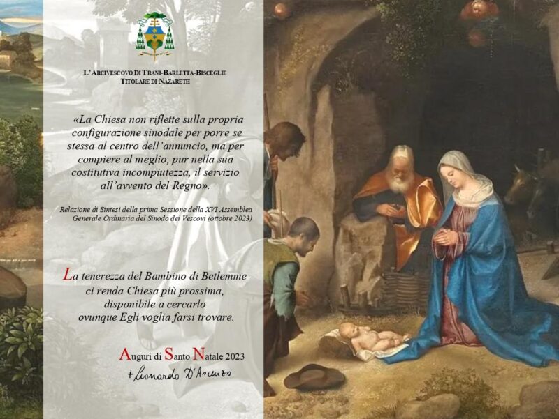 L’ARCIVESCOVO INCONTRA I GIORNALISTI PER UNA SUA RIFLESSIONE SUL NATALE Martedì 19 dicembre 2023, a Trani, nella Curia Arcivescovile, alle ore 17.00, Mons. Leonardo D’Ascenzo, Arcivescovo di Trani-Barletta-Bisceglie, incontrerà i giornalisti e gli operatori delle comunicazioni sociali per porgere una sua riflessione sul Natale e per lo scambio degli auguri. Pertanto si invitano le diverse testate giornalistiche a prendere parte all’incontro ai fini della … Continua a leggere