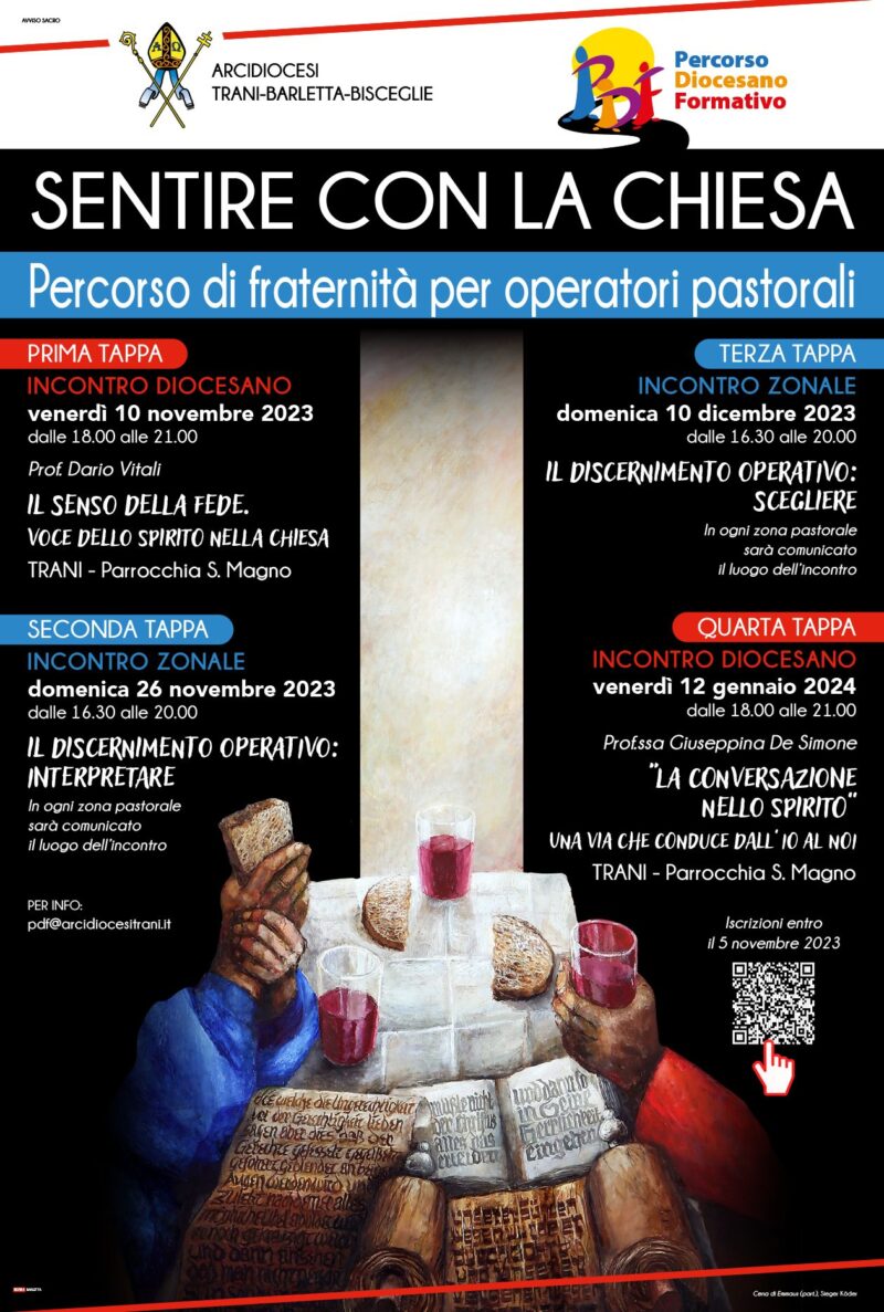 Venerdì 10 novembre alle ore 18 presso la Chiesa di san Magno a Trani avrà inizio il Percorso Diocesano di Formazione (PDF) “Sentire con la Chiesa. Percorso di fraternità per operatori pastorali” con il Prof. Dario Vitali. Le iscrizioni al percorso, rivolto a laici, presbiteri, diaconi e consacrati, si possono fare al seguente link entro domenica 5 novembre loc. Percorso Diocesano Formativo 2023-web-OK
