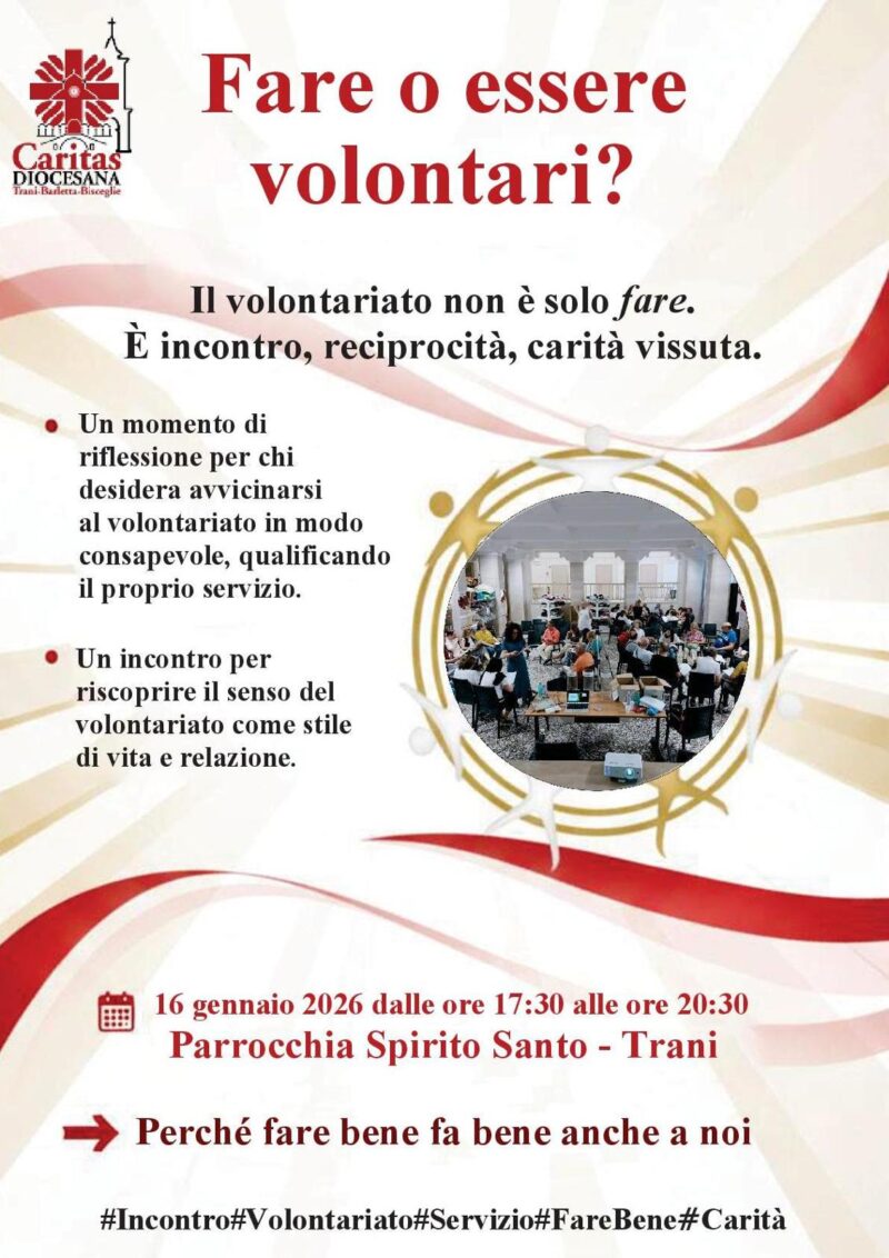 L’appuntamento è fissato per il 16 gennaio 2026, dalle ore 17.30 alle ore 20.30, presso la Parrocchia Spirito Santo di Trani. La proposta si inserisce nel cammino formativo promosso dalla Caritas diocesana, con l’intento di offrire strumenti di discernimento e motivazioni profonde a chi già opera nel volontariato e a chi desidera intraprendere questo percorso.