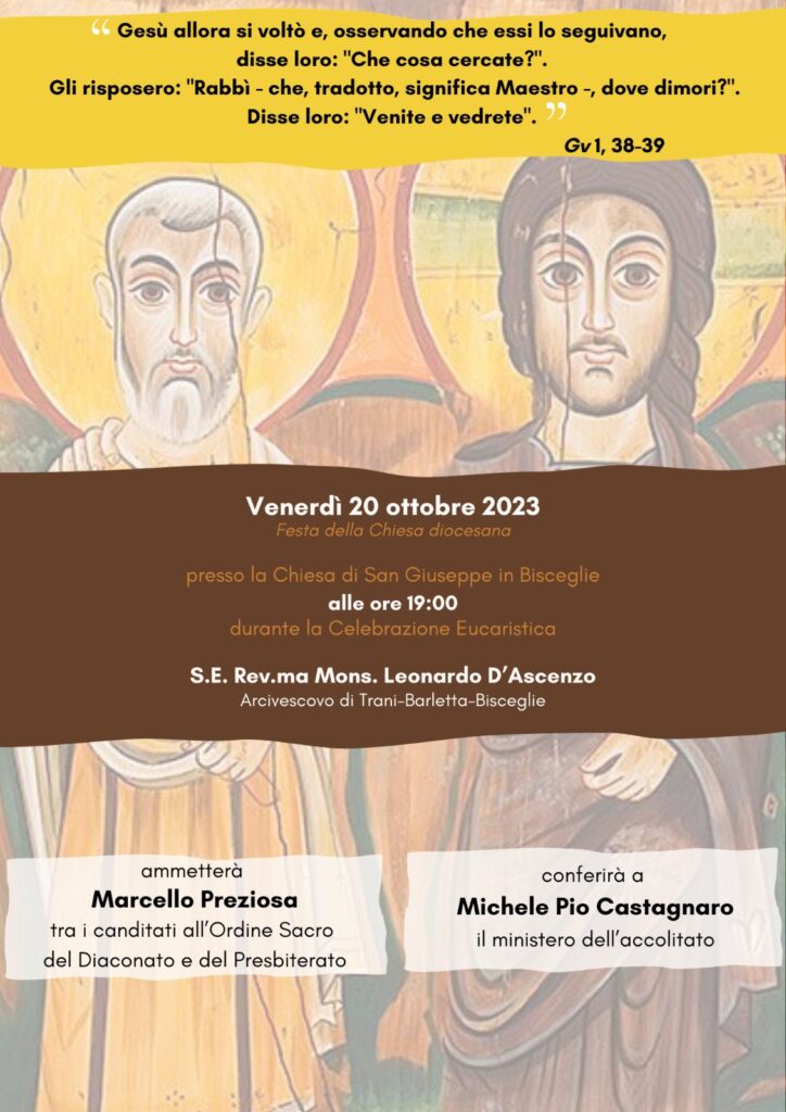 Nell’odierna celebrazione – che sarà trasmessa in diretta televisiva su Easy Tv canale 81 – l’Arcivescovo Mons. Leonardo D’Ascenzo effettuerà il mandato missionario agli operatori pastorali,  nonché effettuerà l’ammissione tra i candidati all’Ordine sacro del Diaconato e Presbiterato del seminarista Marcello Preziosa (originario dalla parrocchia biscegliese di Santa Maria Madre della Misericordia) e il conferimento del ministero dell’accolitato al seminarista Michele Pio Castagnaro (originario dalla parrocchia barlettana del Buon Pastore  ma attualmente inserito nella pastorale presso la parrocchia Spirito Santo in Trani).