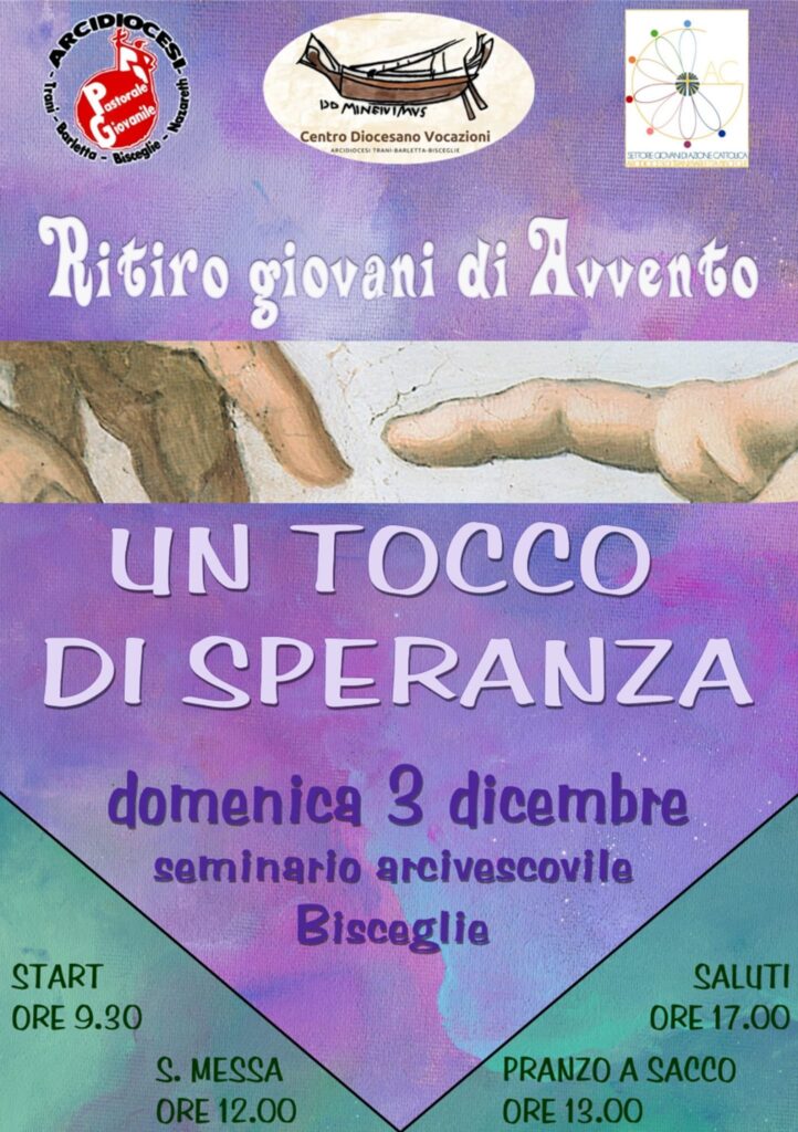Ci ritroveremo il 3 DICEMBRE a partire dalle ore 9.30 presso il seminario arcivescovile di bisceglie. Pranzo a sacco, S. Messa con l’Arcivescovo alle ore 12.00 e conclusione intorno le ore 17.00.