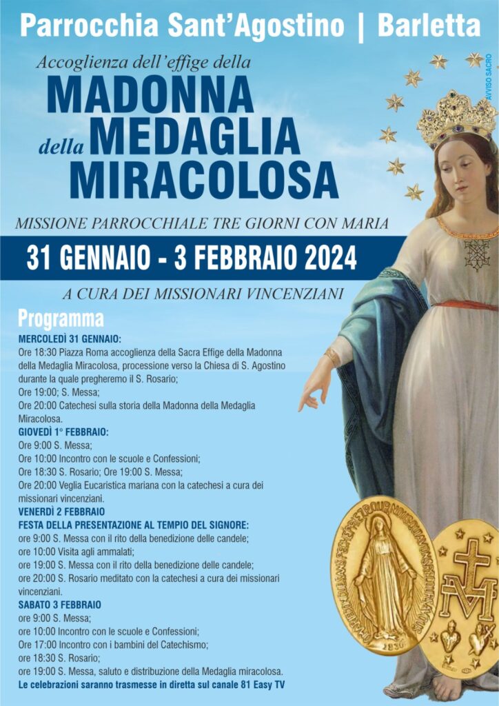 Mercoledì 31 gennaio: alle 18.30 in Piazza Roma l’accoglienza della Sacra Effige della Madonna della Medaglia Miracolosa e la processione verso la chiesa di S. Agostino durante la quale sarà recitato il S. Rosario; alle 19 la celebrazione della S. Messa e a seguire, alle 20 la Catechesi sulla storia della Madonna della Medaglia Miracolosa.
