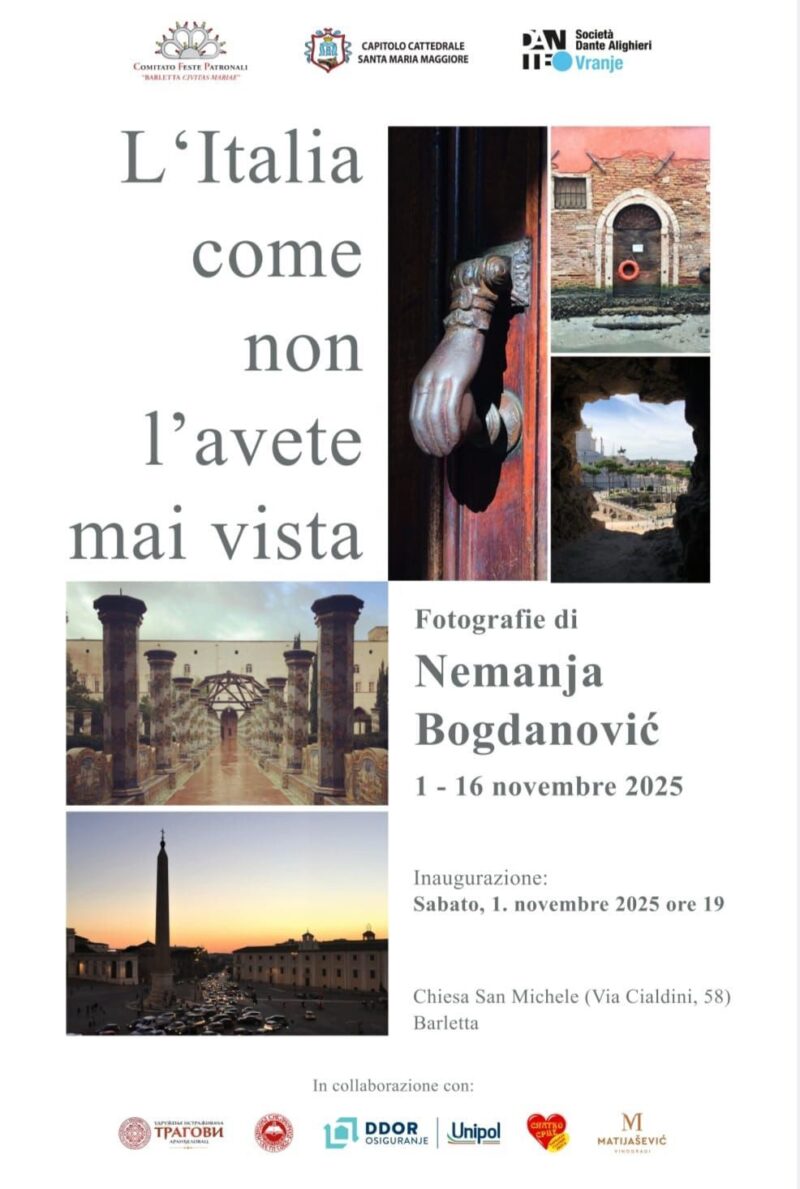Dal 1° al 16 novembre 2025, la Chiesa di San Michele a Barletta ospiterà la mostra fotografica “L’Italia come non l’avete mai vista” del fotografo Nemanja Bogdanović. L’esposizione, promossa dal Comitato Feste Patronali “Barletta Civitas Mariae” e dal Capitolo Cattedrale Santa Maria Maggiore, in collaborazione con la Società Dante Alighieri – Comitato di Vranje, offre un percorso visivo unico tra i luoghi e i dettagli meno noti del patrimonio italiano.