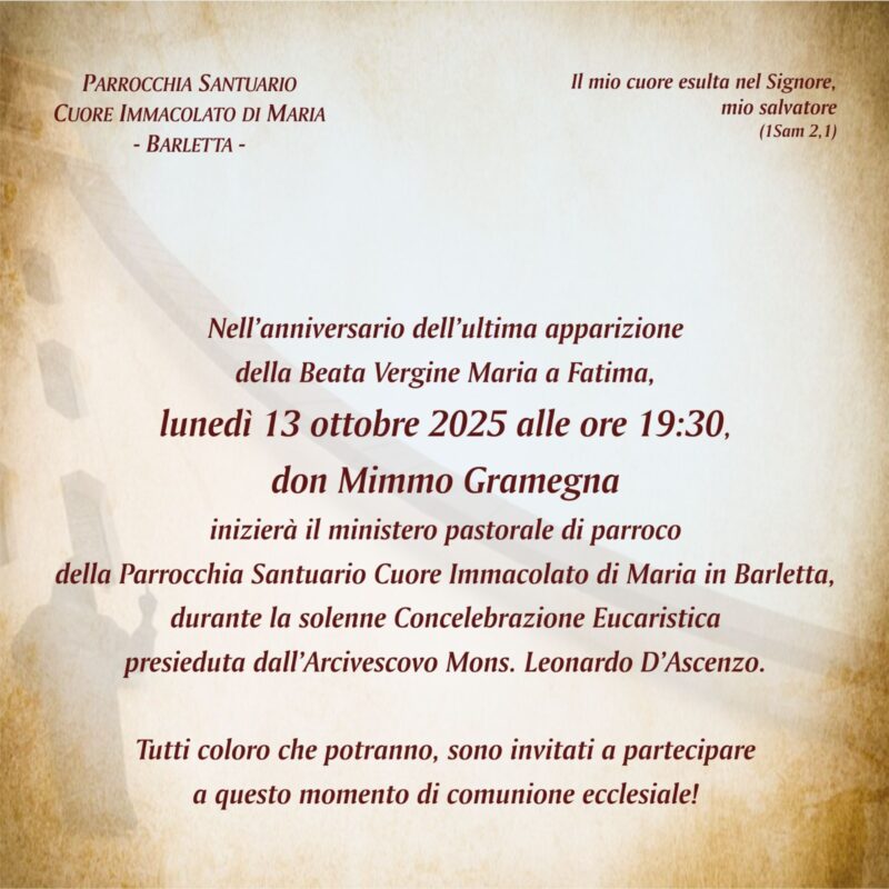 Lunedì 13 ottobre 2025, in occasione dell’anniversario dell’ultima apparizione della Beata Vergine Maria a Fatima, a Barletta, nella parrocchia Cuore immacolato di Maria, alle ore 19.30, durante la celebrazione eucaristica presieduta dall’Arcivescovo mons. Leonardo D’Ascenzo, don Mimmo Gramegna inizierà il suo ministero di parroco, succedendo a don Leonardo Sgarra.