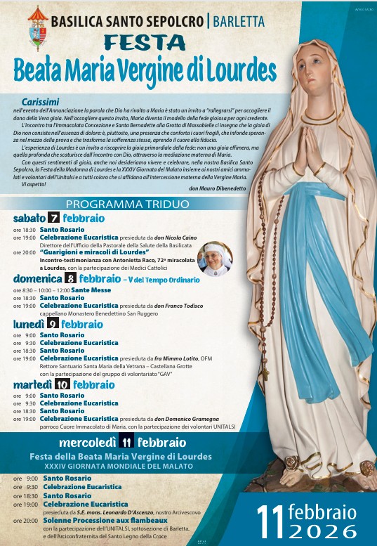 Barletta si prepara a vivere un intenso momento di fede e spiritualità in occasione della Festa della Beata Maria Vergine di Lourdes, che si svolgerà presso la Basilica del Santo Sepolcro dal 7 all’11 febbraio 2026. L’evento, inserito nel contesto della XXXIV Giornata Mondiale del Malato, rappresenta un appuntamento significativo per la comunità ecclesiale e civile, offrendo occasioni di preghiera, riflessione e testimonianza, con particolare … Continua a leggere