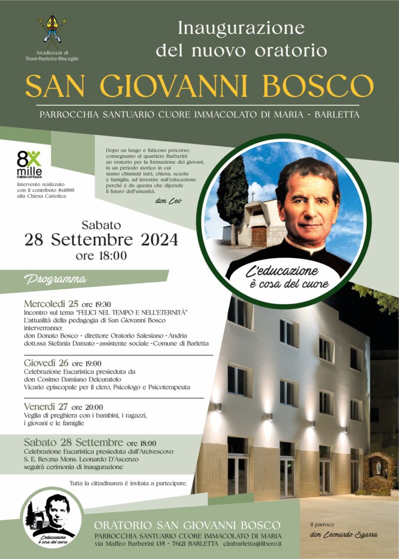 BARLETTA. L’INAUGURAZIONE DEL NUOVO ORATORIO DEDICATO A SAN GIOVANNI BOSCO L’opera sorta nel quartiere Barberini presso la parrocchia Cuore Immacolato di Maria. La santa messa presieduta dall’Arcivescovo La comunità di Barletta si appresta a vivere un momento di grande gioia e partecipazione. Sabato 28 settembre 2024, presso la parrocchia Cuore Immacolato di Maria, alle ore 18.00, sarà inaugurato il nuovo Oratorio dedicato … Continua a leggere