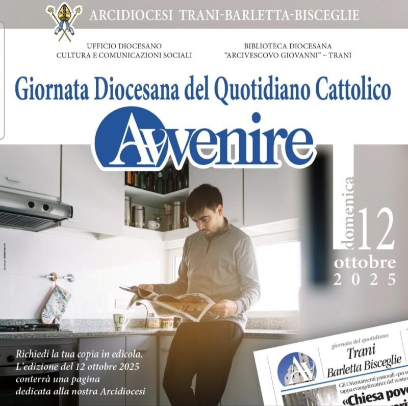 L’Arcidiocesi di Trani-Barletta-Bisceglie, attraverso l’Ufficio diocesano per la cultura e le comunicazioni sociali e la Biblioteca diocesana “Arcivescovo Giovanni” di Trani, celebra domenica 12 ottobre 2025 la Giornata diocesana del Quotidiano Cattolico Avvenire, un appuntamento significativo per riscoprire il valore della buona informazione e dell’impegno cristiano nel mondo della comunicazione. L’iniziativa, ormai tradizionale nel calendario diocesano, rappresenta un’occasione preziosa per promuovere la conoscenza e la … Continua a leggere