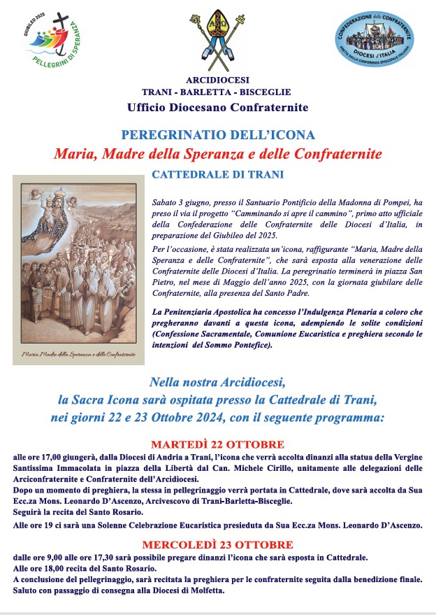 Nella nostra Arcidiocesi, la Sacra Icona sarà ospitata presso la Cattedrale di Trani, nei giorni 22 e 23 Ottobre 2024, con il seguente programma: