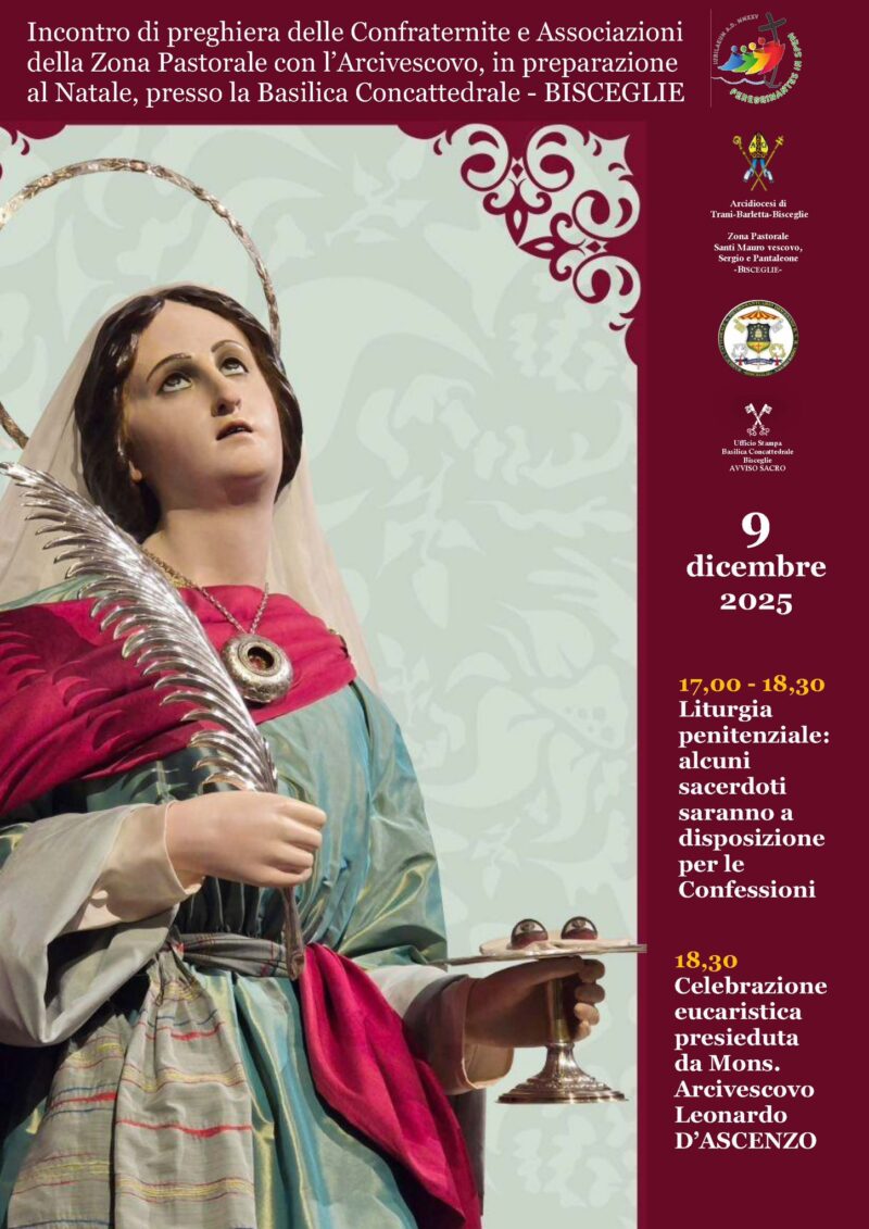 La comunità ecclesiale di Bisceglie si prepara a vivere un significativo momento di spiritualità in vista del Natale. Nella cornice della Basilica Concattedrale, le Confraternite e le Associazioni della Zona Pastorale parteciperanno a un incontro di preghiera insieme all’Arcivescovo, un’occasione pensata per rinsaldare il cammino comune e rinnovare lo spirito comunitario nel periodo che introduce alla solennità natalizia. L’appuntamento, fissato per il 9 dicembre 2025, … Continua a leggere