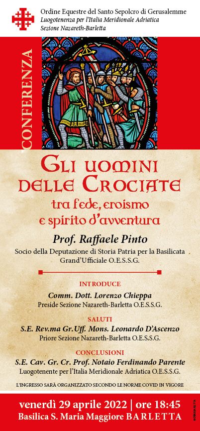 BARLETTA. CONFERENZA SU “GLI UOMINI DELLE CROCIATE: TRA FEDE, EROISMO E SPIRITO D’AVVENTURA” Venerdì 29 aprile, a Barletta, nella Basilica S. Maria Maggiore, alle ore 18.45, si terrà una conferenza sul tema “Gli uomini delle Crociate: tra fede, eroismo e spirito d’avventura”. Il relatore sarà il prof. Raffaele Pinto, da anni impegnato nella ricerca storica e con al suo attivo numerosi saggi presenti nelle principali … Continua a leggere