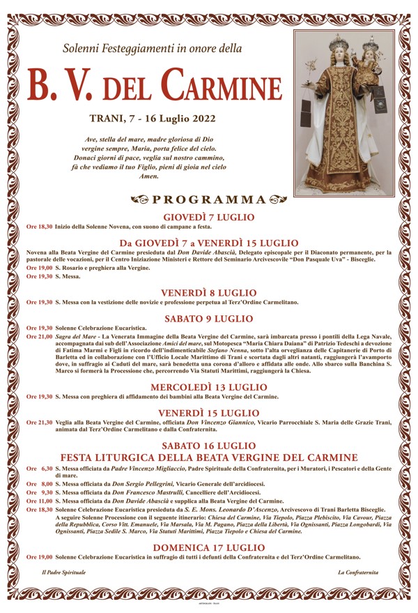 Il programma dei solenni festeggiamenti in onore del patrono della Città di Trani, S. Nicola il Pellegrino, in programma da venerdì 29 luglio a lunedì 1 agosto. Di seguito gli eventi: Mercoledì 27 luglio 2022: Ore 18.30 – Piazza della Libertà – “Sulle orme del Pellegrino” – Itinerario per i più piccoli sui luoghi di San Nicola, amico dei bambini, a cura dell’associazione “Tranensis”. Venerdì … Continua a leggere