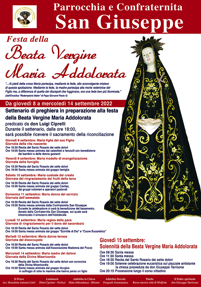 CORATO. FESTA DI SANTA MARIA GRECA PER METTERCI ALLA SEQUELA DELLA MADONNA Il 18 luglio si festeggia a Corato la Festa di Santa Maria Greca, Protettrice principale della Città, in ricordo di quanto avvenuto nel 1656, anno del prodigioso ritrovamento dell’Icona della Vergine e conseguente liberazione di Corato dal morbo della peste. Dopo due anni di stop a motivo dell’emergenza sanitaria, quest’anno, lunedì 18 luglio, … Continua a leggere
