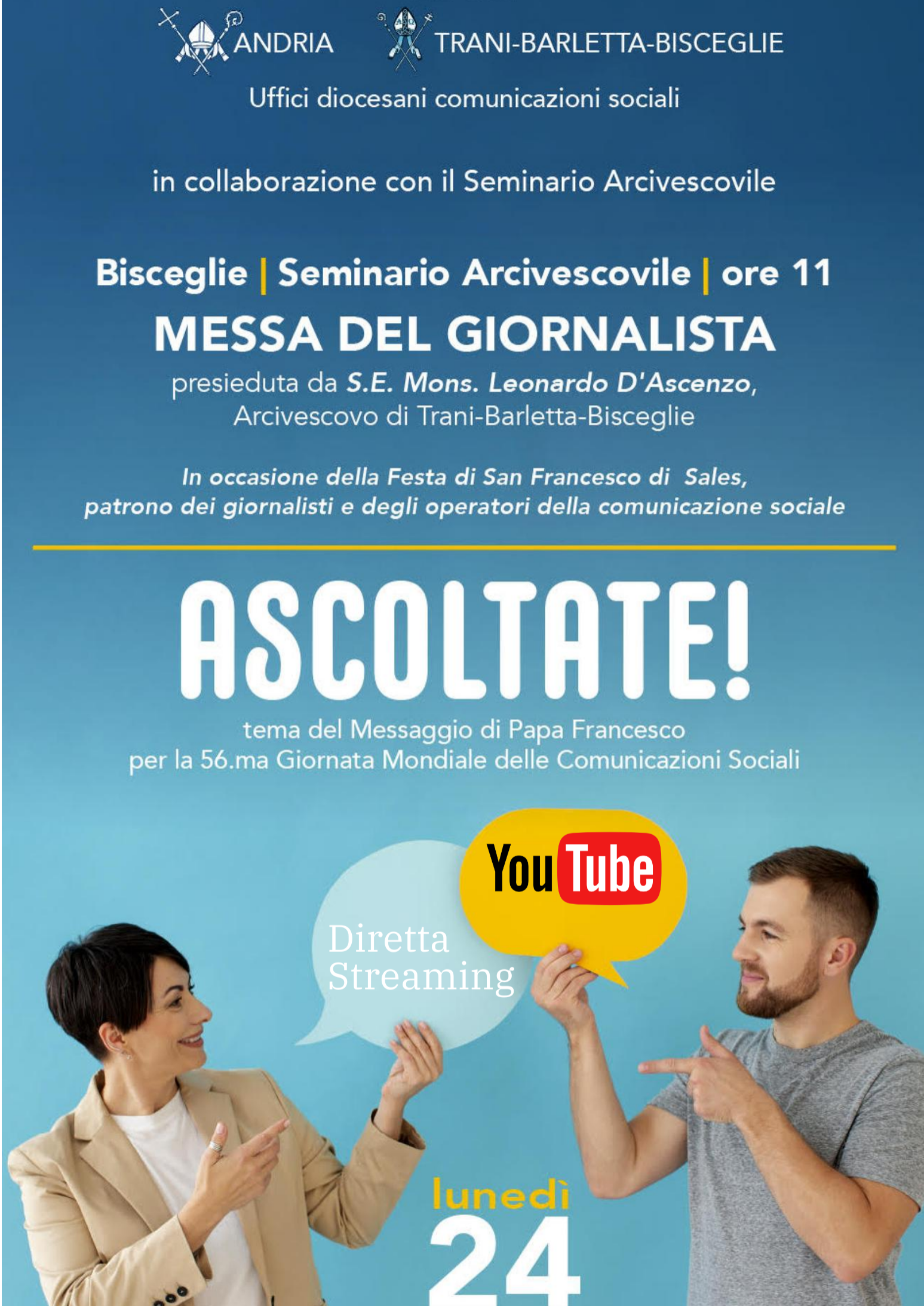 Anche quest’anno le diocesi di Andria e Trani si ritroveranno assieme in occasione della memoria liturgica di San Francesco di Sales, patrono dei giornalisti e degli operatori della comunicazione sociale.