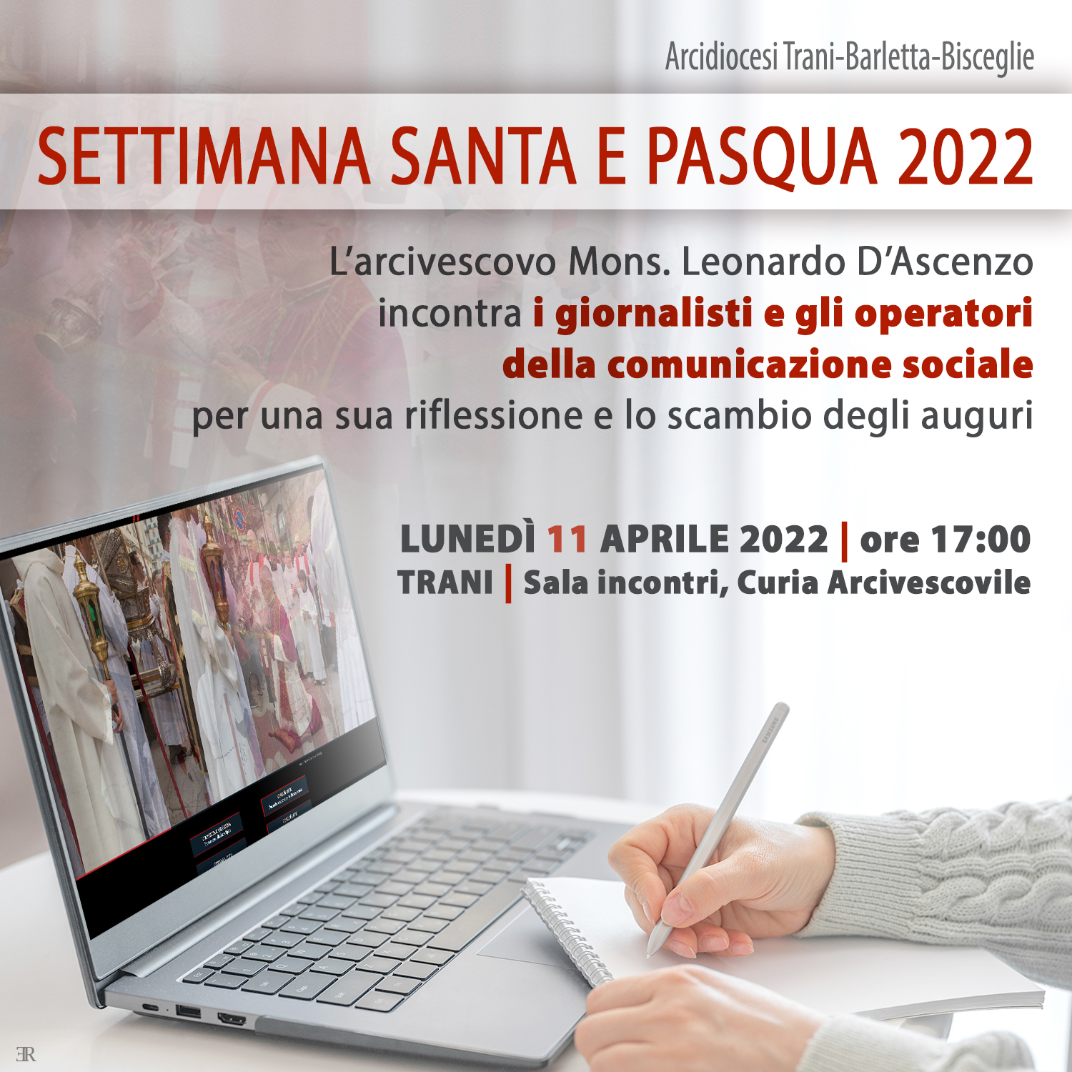 Lunedì 11 aprile, a Trani, nella Curia Arcivescovile, alle ore 17.00, l’Arcivescovo Mons. Leonardo D’Ascenzo incontrerà i giornalisti e gli operatori della comunicazione sociale sul per una riflessione sulla Quaresima e Pasqua, e per lo scambio degli auguri.