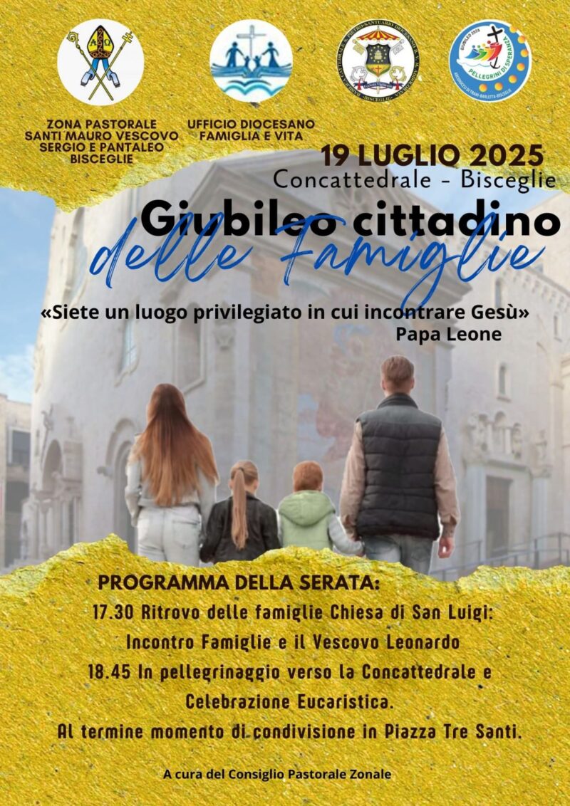 Sabato 19 luglio le famiglie della zona pastorale di Bisceglie sono invitate a vivere un’esperienza di incontro e condivisione all’insegna della fraternità, della fede e dell’unità. L’iniziativa, promossa dalla Pastorale Familiare cittadina, rappresenta un momento significativo di comunione, che vedrà la partecipazione del nostro Arcivescovo. L’incontro si aprirà con un tempo di accoglienza e riflessione comunitaria, presso la Chiesa di San Luigi, pensato per offrire … Continua a leggere »