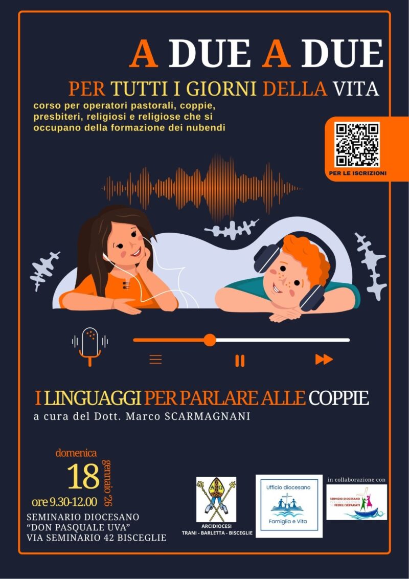 Il primo appuntamento del percorso, dal titolo “I linguaggi per parlare alle coppie”, è in programma per domenica 18 gennaio 2026, dalle ore 9.30 alle 12.00, presso il Seminario diocesano “Don Pasquale Uva”, in via Seminario 42 a Bisceglie. L’incontro è curato dal dott. Marco Scarmagnani, consulente di coppia, Verona, e intende approfondire modalità comunicative capaci di favorire l’ascolto, la comprensione e l’accompagnamento pastorale nel cammino coniugale e familiare.