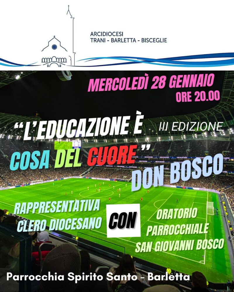 Un appuntamento che unisce sport, fraternità e spirito natalizio è quello promosso dall’Arcidiocesi di Trani-Barletta-Bisceglie con la terza edizione della partita di calcio natalizia, in programma lunedì 15 dicembre alle ore 20.30 presso la Parrocchia San Giovanni Apostolo di Barletta. L’iniziativa, ormai divenuta una tradizione attesa, si inserisce nel clima di preparazione al Natale come occasione di incontro e condivisione. A scendere in campo saranno … Continua a leggere