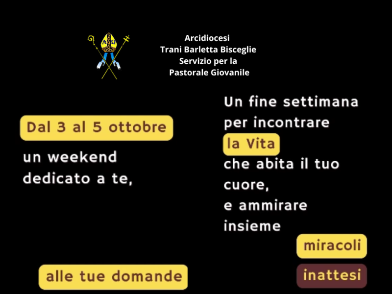 Dal 3 al 5 ottobre, presso il Seminario Diocesano "Don Pasquale Uva" di Bisceglie, vivremo un weekend di formazione e fraternità per giovani organizzato dal Servizio Diocesano di Pastorale Giovanile.