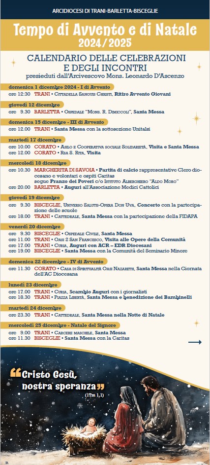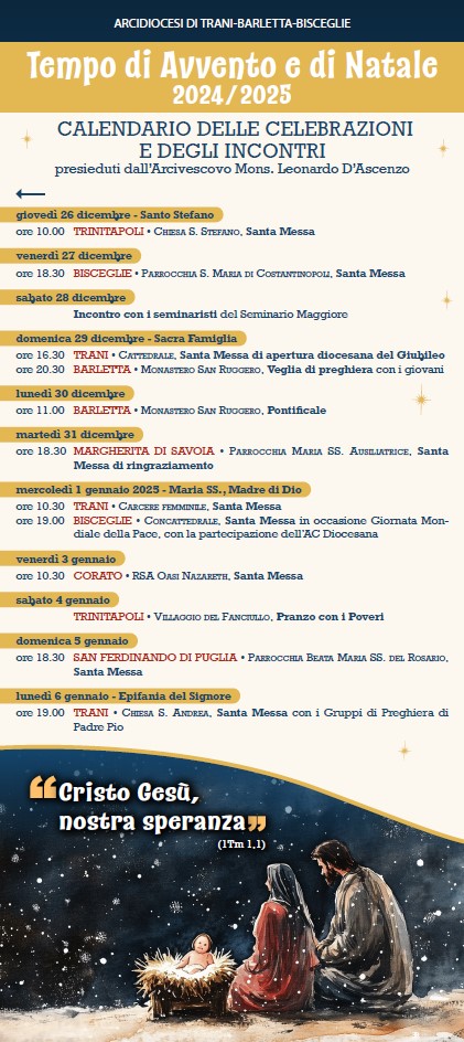 - ore 18.30 TRANI • Piazza Libertà, Santa Messa e benedizione dei Bambinelli