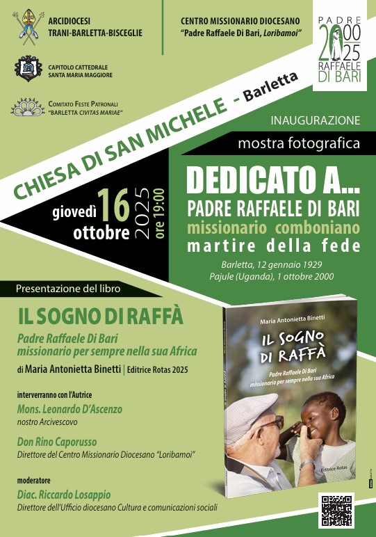 La Chiesa di San Michele di Barletta ospiterà giovedì 16 ottobre 2025, alle ore 19.00, un appuntamento di profonda spiritualità e memoria missionaria: l’inaugurazione della mostra fotografica “Dedicato a Padre Raffaele Di Bari, missionario comboniano martire della fede”.  Saranno esposte altresì alcune reliquie di Padre Raffaele.