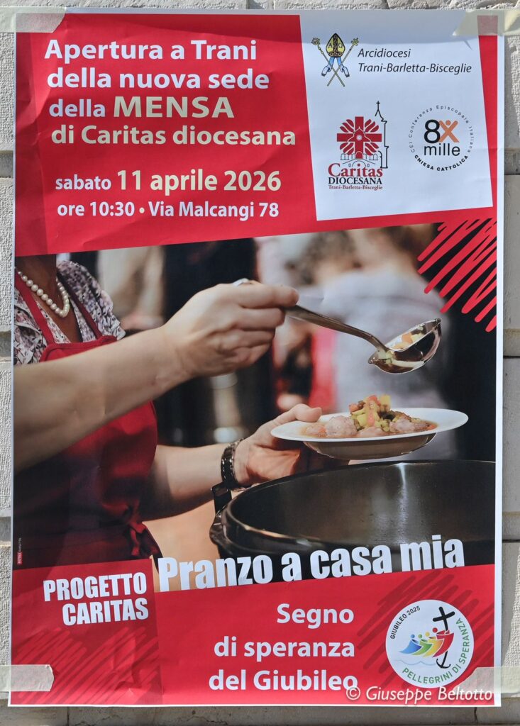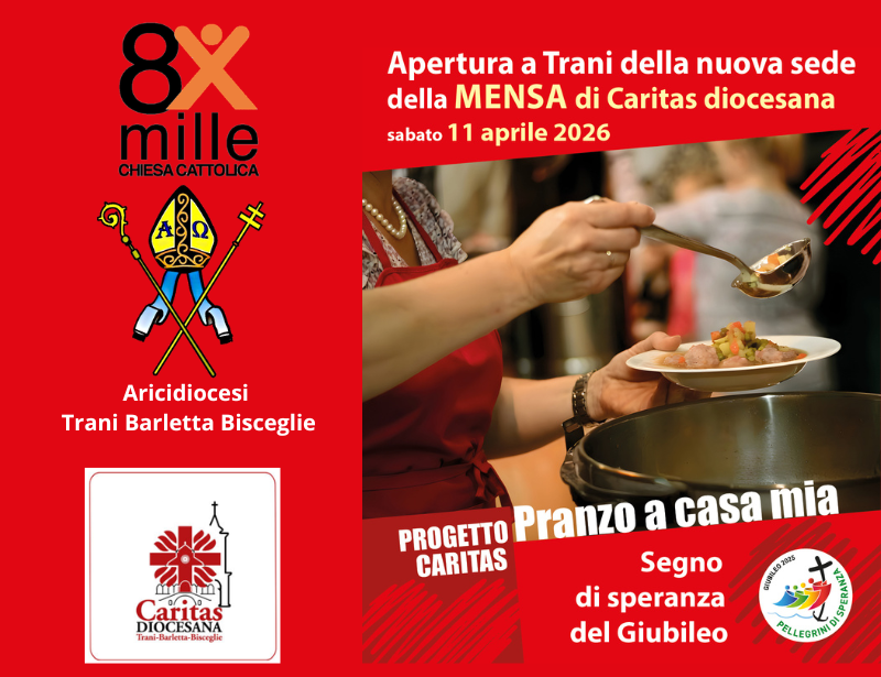 Sabato 11 aprile 2026, a Trani, in via Malcangi 78, alle 10.30, l’Arcivescovo mons. Leonardo D’Ascenzo inaugurerà la nuova sede della mensa della Caritas diocesana di Trani-Barletta-Bisceglie.