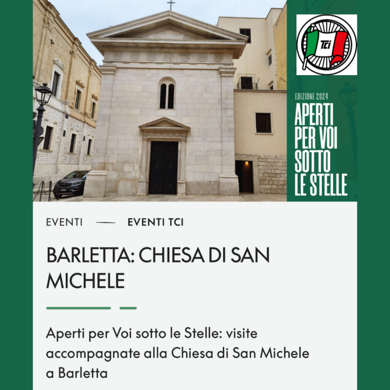 Dal 21 al 23 giugno, il Touring Club Italiano celebra i suoi 130 anni con l’evento “Aperti per Voi Sotto le Stelle”. Questo evento offre visite serali e straordinarie a chiese, palazzi, monumenti e aree archeologiche normalmente non accessibili. A Barletta, il 22 giugno, sarà possibile visitare la Chiesa di San Michele, riedificata nel 1701, che conserva affreschi e pavimentazioni antiche. L’evento prevede anche un’esibizione … Continua a leggere »