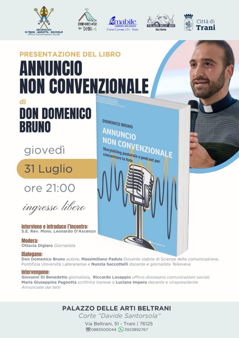 TRANI. PRESENTAZIONE DEL LIBRO DI DON MIMMO BRUNO SU “STORYTELLING E PODCAST” Giovedì 31 luglio ore 21:00, presso palazzo Beltrani di Trani, si terrà la presentazione del libro “Annuncio non convenzionale. Storytelling pastorale e podcast per comunicare la fede” scritto da Domenico Bruno per Tau Editrice. L’iniziativa, patrocinata da diverse realtà del territorio tra cui l’Arcidiocesi di Trani-Barletta-Bisceglie e la città di Trani, sarà divisa … Continua a leggere »