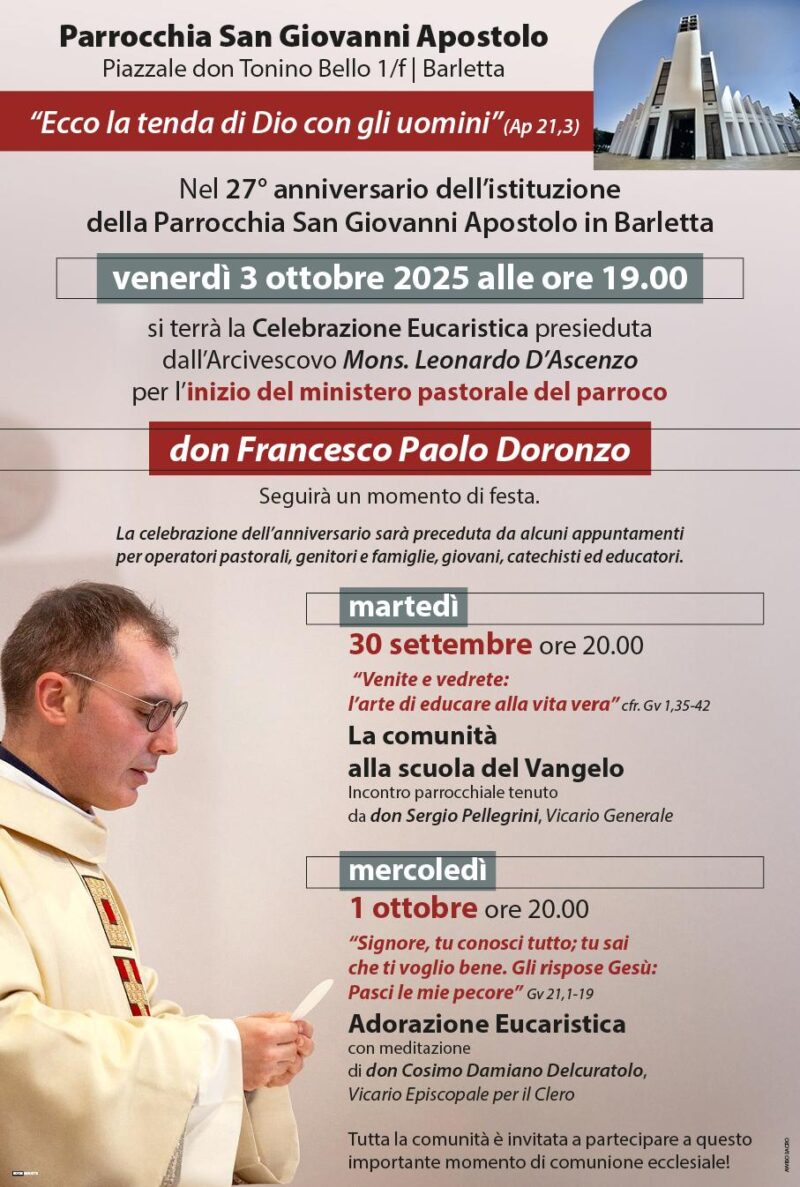 Venerdì 3 ottobre 2025, a Barletta, nella parrocchia San Giovanni Apostolo, presso il Piazzale don Tonino Bello 1/F, alle ore 19.00,  durante la celebrazione eucaristica presieduta  dall’Arcivescovo mons. Leonardo D’Ascenzo, don Francesco Doronzo inizierà il suo ministero di parroco. L’evento si inserisce nelle celebrazioni per il 27° anniversario dell’istituzione della parrocchia San Giovanni Apostolo. In vista della celebrazione, martedì 30 settembre, alle ore 20.00, … Continua a leggere »