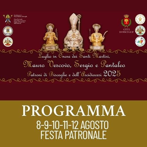 Il mese di luglio a Bisceglie sarà interamente dedicato alla devozione verso i Santi Martiri Mauro Vescovo, Sergio e Pantaleo, patroni della città e dell’Arcidiocesi. Un ricco programma di celebrazioni religiose, pellegrinaggi, momenti di preghiera e iniziative pastorali accompagnerà fedeli e cittadini fino alla grande solennità del 27 luglio 2025, rinnovando una tradizione profondamente radicata nella storia e nella fede della comunità biscegliese.