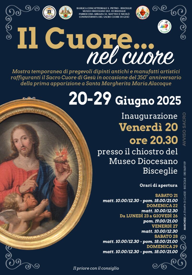 Dal 20 al 29 giugno 2025 il chiostro del Museo Diocesano di Bisceglie ospiterà la mostra temporanea “Il Cuore… nel cuore”, un’esposizione di pregevoli dipinti antichi e manufatti artistici dedicati al Sacro Cuore di Gesù. L’iniziativa è promossa dalla Basilica Concattedrale San Pietro di Bisceglie, dalla sezione di Bisceglie del Museo Diocesano, dalla Parrocchia Abbazia Santi Matteo e Nicolò e dalla Confraternita del Sacro Cuore … Continua a leggere