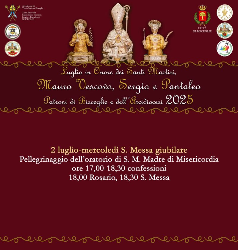 02.07.2025 LIBRETTO SANTA MESSA Si aprono le celebrazioni in onore dei Santi Martiri Mauro Vescovo, Sergio e Pantaleo, Patroni di Bisceglie e dell’intera Arcidiocesi, con un momento di particolare intensità spirituale previsto per mercoledì 2 luglio 2025. La data segnerà infatti uno dei primi appuntamenti del mese dedicato alla venerazione dei Santi Patroni. Nella stessa giornata ci sarà la visita ed il pellegrinaggio organizzato dall’oratorio … Continua a leggere