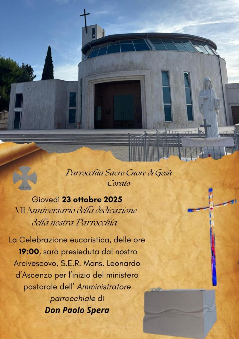 Giovedì 23 ottobre 2025, a Corato, nella parrocchia Sacro Cuore di Gesù, alle ore 19.00, durante la celebrazione eucaristica presieduta dall’Arcivescovo mons. Leonardo D’Ascenzo, don Paolo Spera inizierà il suo ministero di amministratore parrocchiale, succedendo a don Vito Martinelli.
