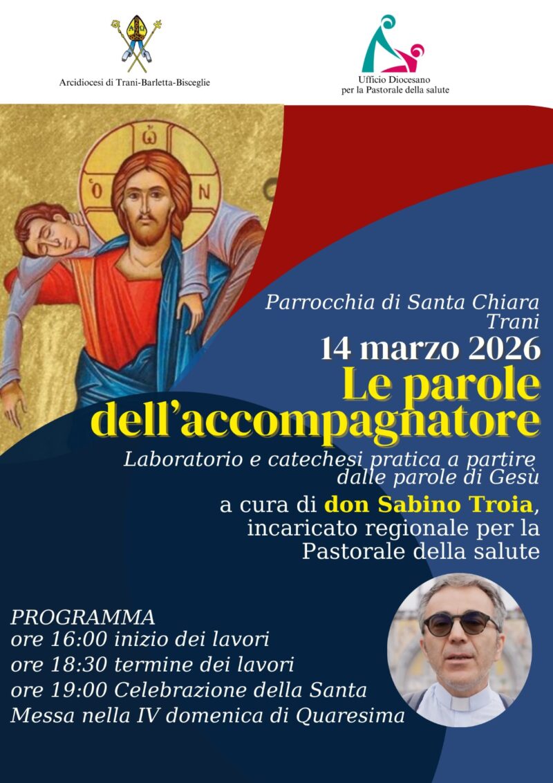 Si terrà sabato 14 marzo 2026 presso la parrocchia di Santa Chiara a Trani un momento di formazione e riflessione dedicato agli operatori della pastorale della salute e a quanti sono impegnati nell’accompagnamento spirituale delle persone malate o fragili. L’iniziativa, dal titolo “Le parole dell’accompagnatore”, si presenta come un laboratorio e una catechesi pratica ispirata alle parole di Gesù e orientata a offrire strumenti concreti per il servizio pastorale.