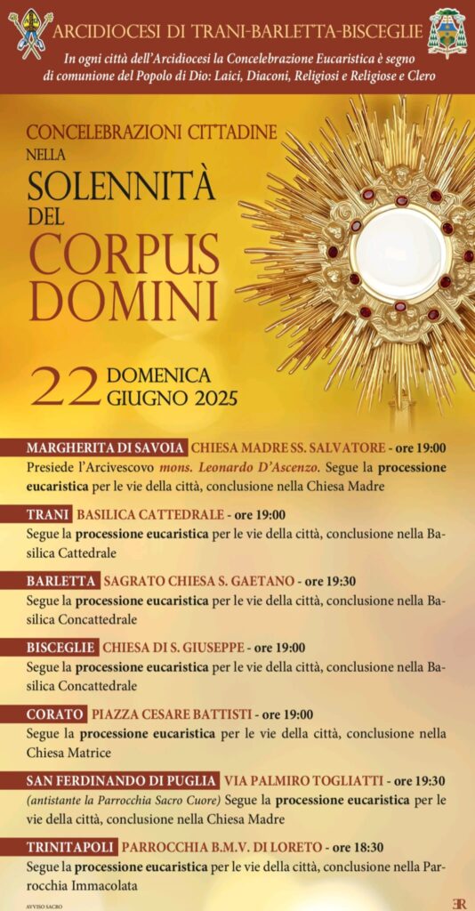 Domenica 22 giugno 2025, l’Arcidiocesi di Trani-Barletta-Bisceglie si prepara a vivere un momento di intensa comunione ecclesiale con le concelebrazioni cittadine in occasione della Solennità del Corpus Domini. Una ricorrenza centrale per la vita liturgica e spirituale della Chiesa, che pone al centro l’Eucaristia, sacramento della presenza reale di Cristo e segno di unità del Popolo di Dio.