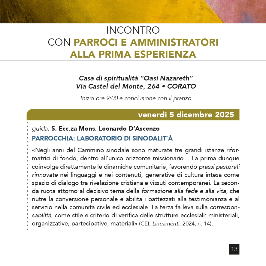 CLERO GIOVANE 5 Dicembre 2025 Casa di spiritualità “Oasi Nazareth” Via Castel del Monte, 264 • CORATO Inizio ore 9:00 e conclusione con il pranzo Incontro con parroci e amministratori alla prima esperienza CORATO 5 DICEMBRE 2025 - Guida: don Cosimo Damiano Delcuratolo PARROCCHIA: LABORATORIO DI SINODALITÀ CLICCA QUI Quello che voglio proteggere Come costruire un ritmo sostenibile Come costruire un ritmo sostenibile Quello che voglio proteggere Incontro con parroci e amministratori alla prima esperienza