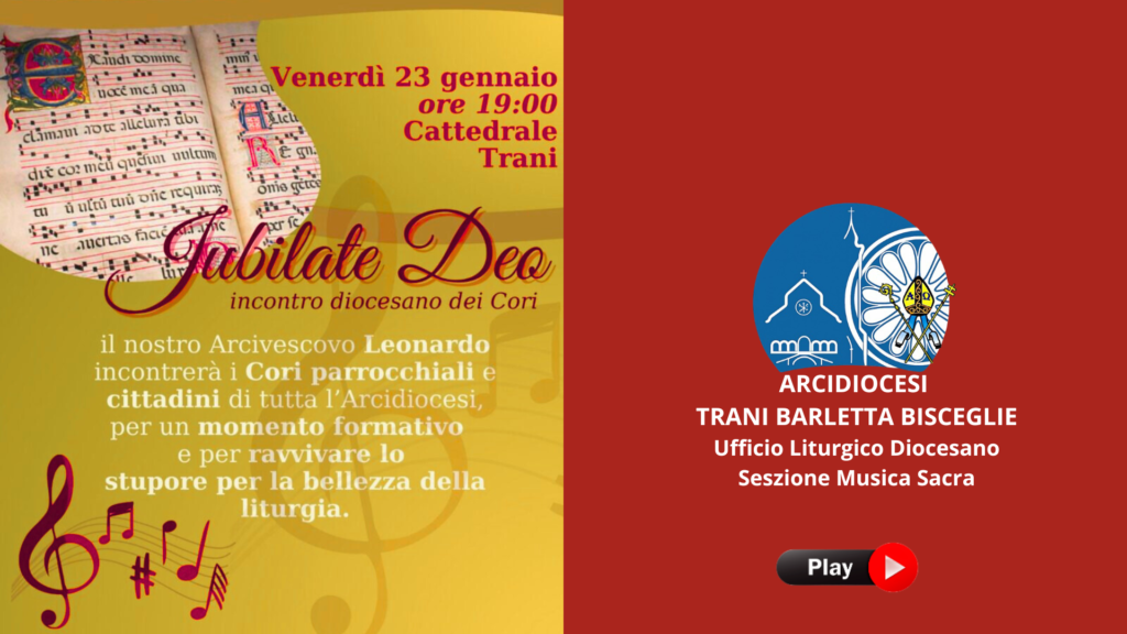 formativo per ravvivare lo stupore per la bellezza della liturgia, fonte e culmine della vita e della missione della Chiesa. Pertanto ci diamo tutti appuntamento venerdì 23 gennaio 2026 alle ore 19.00 a Trani presso la Cattedrale. Per l’occasione uniremo le nostre voci in un solo canto che sarà espressione del nostro stare insieme. Alla presente allego la partitura del canto Jubilate Deo di Lecot, che eseguiremo all’unisono. Nell’attesa di ritrovarci insieme, vi saluto con affetto».